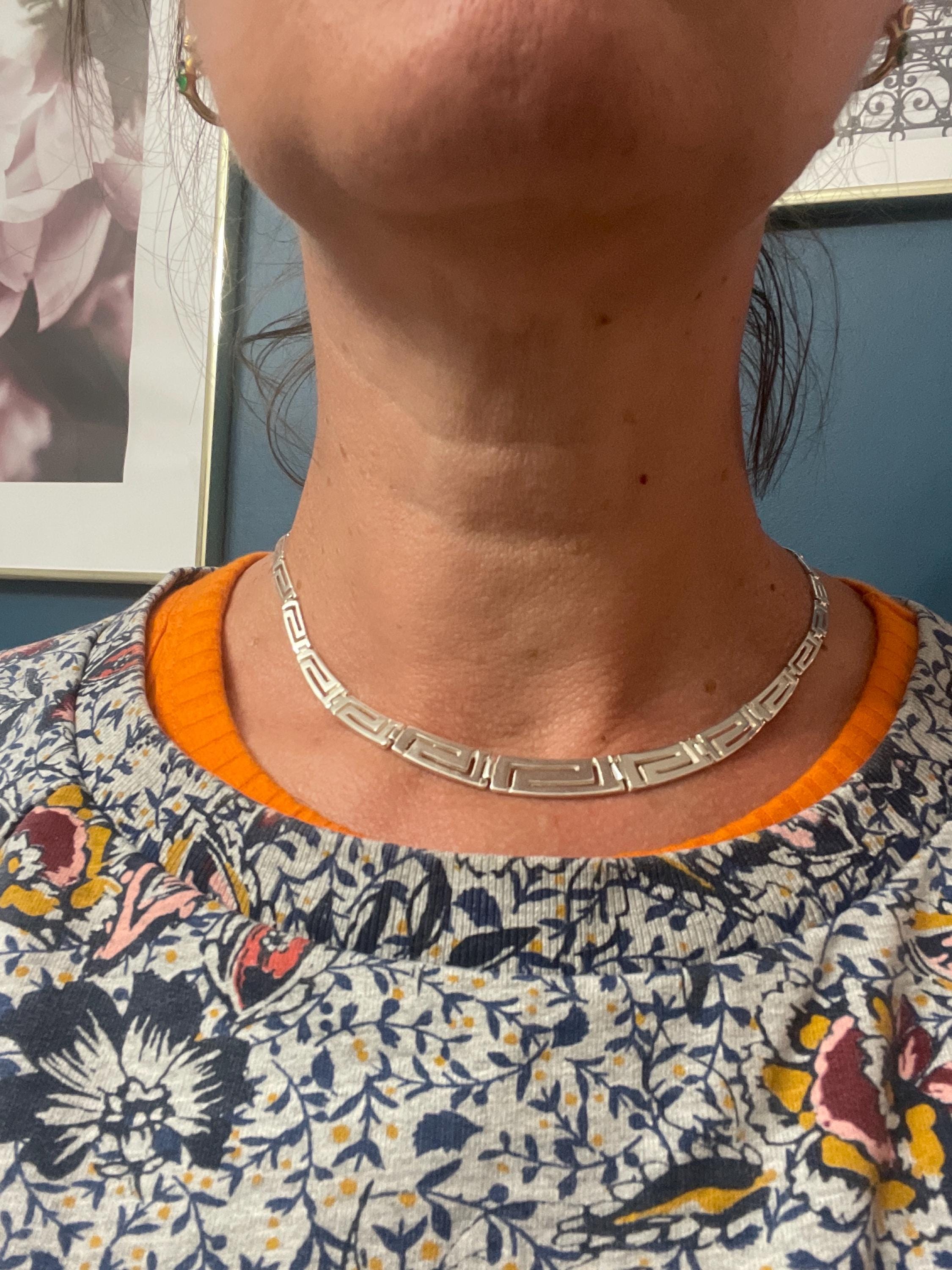 The Greek meander necklace has comfortable hingeing on each link, making the choker suitable for all necklines.